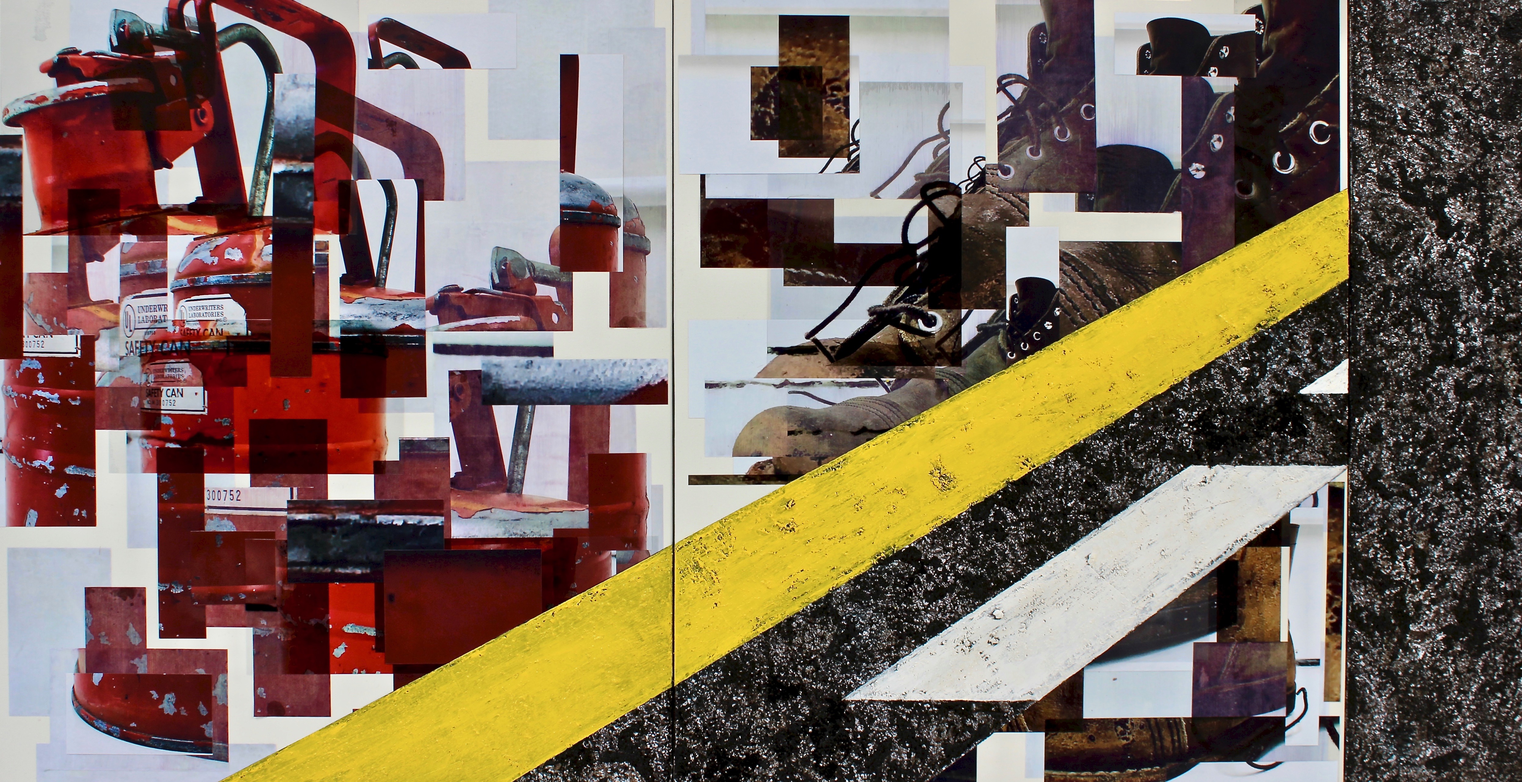 acrylic, paper, photo, plastic on canvas